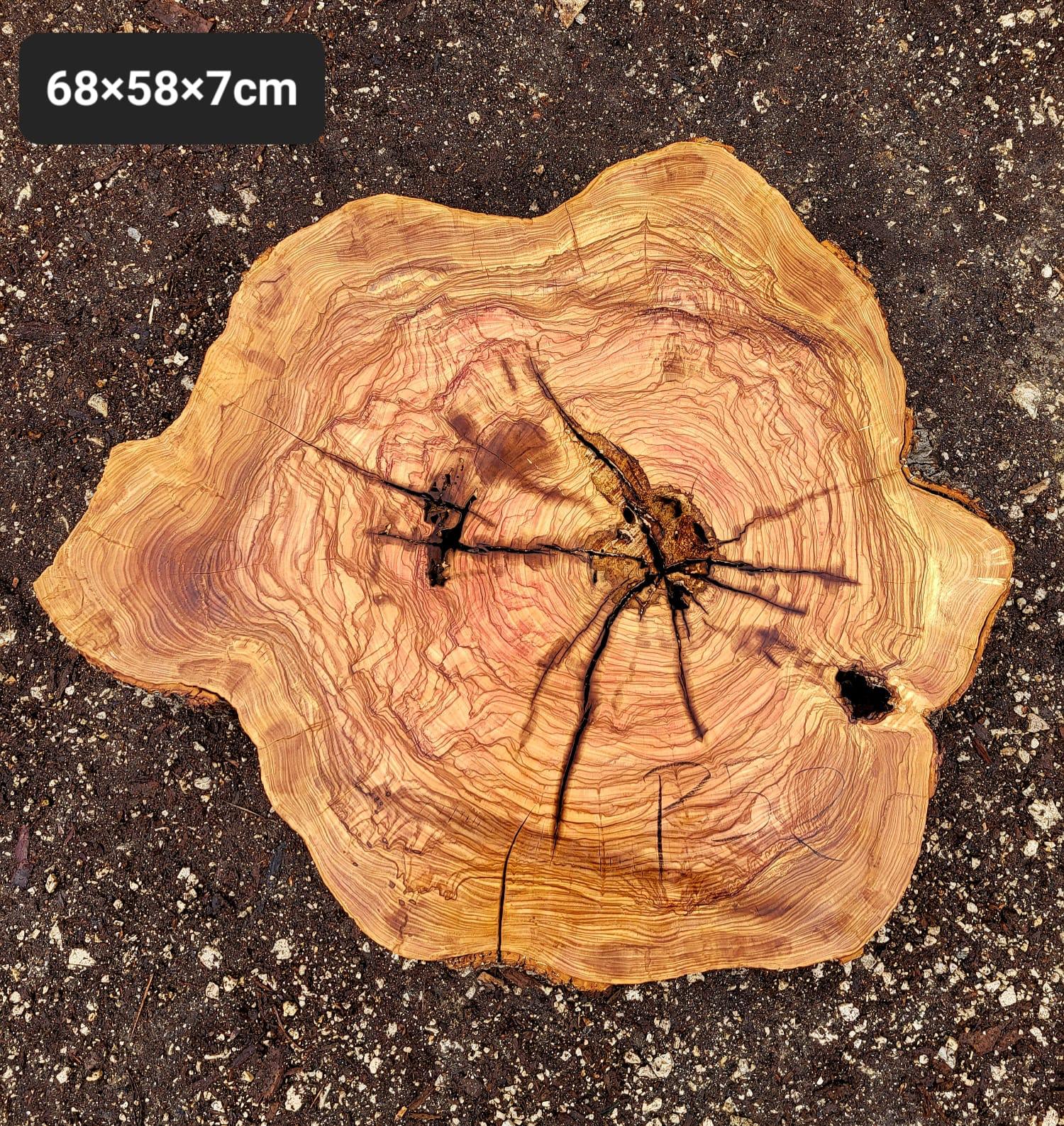 Wunderschöne Baumscheibe aus Olivenholz, unbehandelt. Ideale Ausgangsbasis für ein selbstgemachtes Schneidbrett oder ein Beistelltisch.